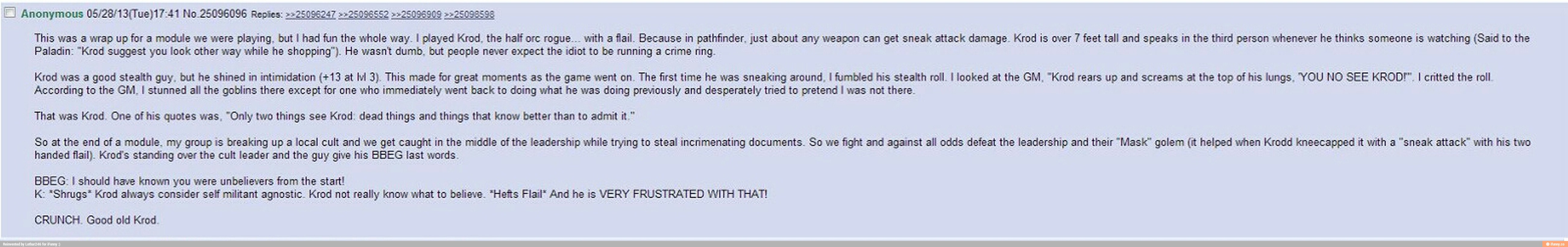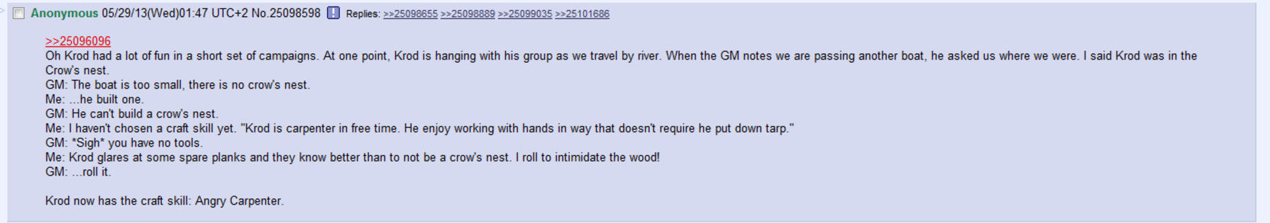 Krod now has the craft skill. Krod the half orc rogue. Suoh Mikoto 850x1024 144 kB K project K project anime Anime. Stolen from DnD twitter. Scribe Killjoy 052813Tue2007 No25099035. Tg - Krod the Angry Carpenter. Still one of my favorite moments was when I had to ad lib a distraction. Weirdest Thing Youve Seen At Your Local GW. My male rpg characters.