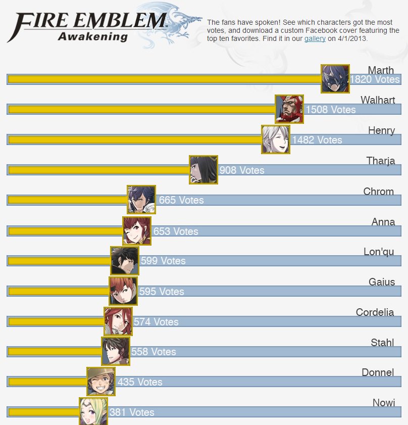Ill post the top and last results for males and females but you can check the rest out for yourself. Heres The Fire Emblem if Fates Character Popularity Poll Results.